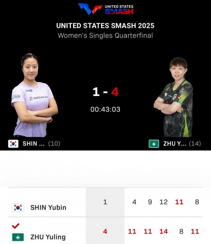 中国澳门选手朱雨玲4-1淘汰申裕斌,晋级美国大满贯女单半决赛