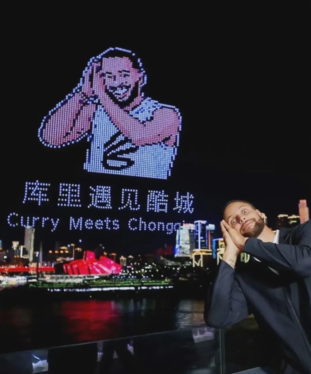 当地政府为欢迎库里和球迷,打造了一系列城市营销活动。两江交汇处的无人机表演再现“库里远投入筐”的精彩瞬间,璀璨的灯光装点了夜空,重现了库里的经典晚安庆祝动作,同时还拼出了“重庆遇见库里”的字样,这一切让库里感动不已,他直言“太疯狂了”。