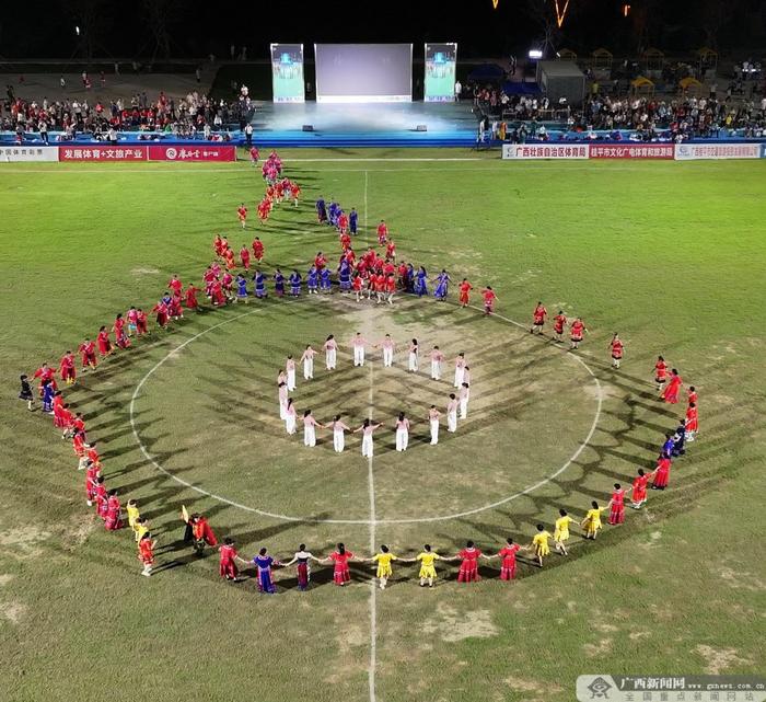 现场文艺演出。据了解,本届“稻香杯”历时两个多月,16支队伍、500余名运动员共奉献36场比赛,打进183粒进球,无论是球员的竞技水平,还是现场组织、观众参与度,都超出预期。从开幕到闭幕,稻香杯足球赛不仅是一场体育竞技,更成为桂平市民的文化盛宴。现场融合了足球比赛、文艺表演和烟花秀等多种元素,让体育赛事变得更加丰富多彩。主办方还提供了免费公交车接送服务,方便球迷观赛,这种无微不至的安排,体现了赛事组织者对于推广草根足球的用心。