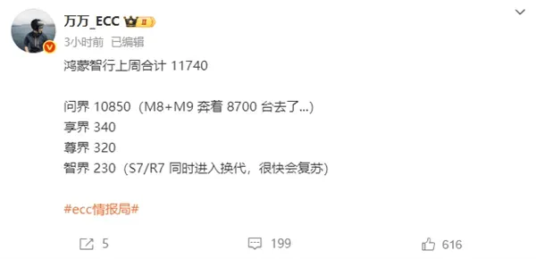 鸿蒙智行排在第三,单周1.17万辆,其中问界依旧是中流砥柱,达到了10850辆,其中M8交付6144辆、M9交付2737辆。