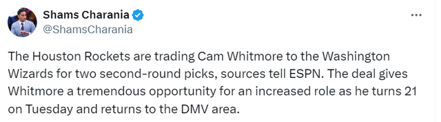 北京时间7月6日,据名记Shams报道,火箭队已同意将前锋卡姆-惠特莫尔交易至奇才队。Shams透露,火箭将换回两个次轮选秀权作为回报。后续报道更新,这两个次轮是2026年公牛的次轮签和2029年国王的次轮签。